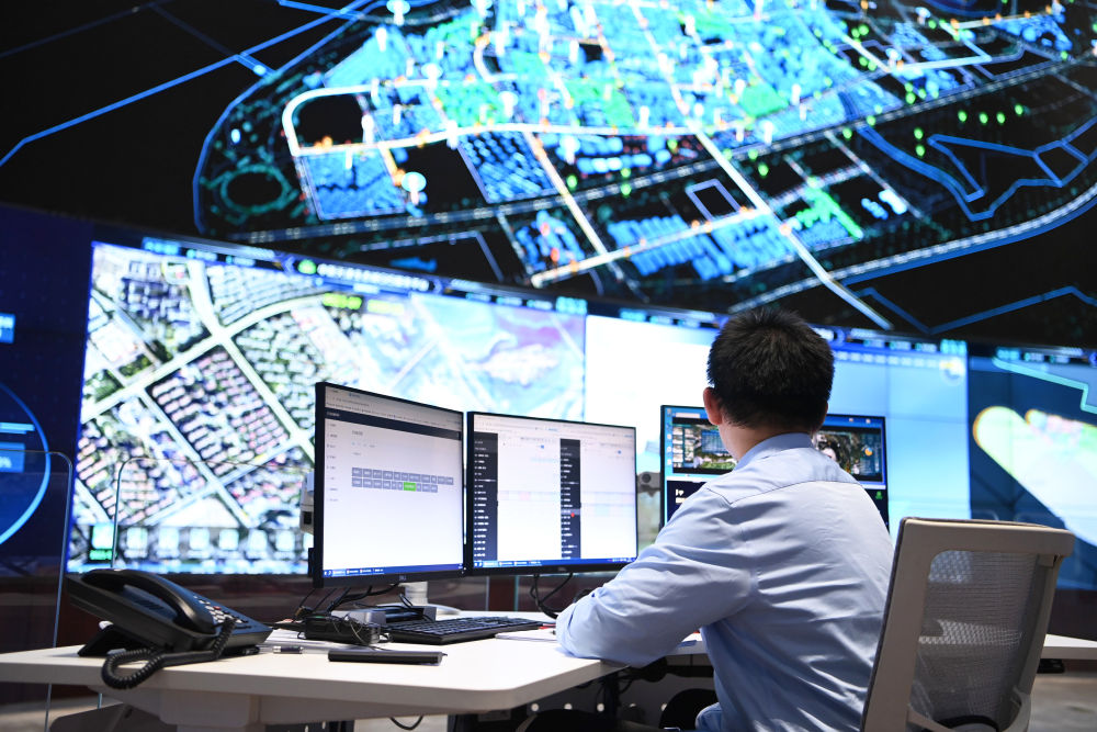 2024年9月27日,工作人员在中新天津生态城智慧城市运营中心内监控。中新天津生态城是中国、新加坡两国政府间重大合作项目,也是首个国家间合作开发的生态城市。智慧小区、智能公交、智慧图书馆、智慧电梯、智慧灯杆……在天津生态城,智能化基础设备已随处可见。