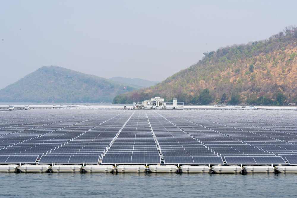 这是泰国孔敬府乌汶叻水面漂浮光伏电站(2024年3月5日摄)。由中国东方电气集团国际合作有限公司承包建设的泰国孔敬府乌汶叻水面漂浮光伏电站位于泰国东北部,是泰国电力局第一个集水面光伏、清洁水电、高效储能系统及智慧能源管理系统于一体的示范性电站工程项目。