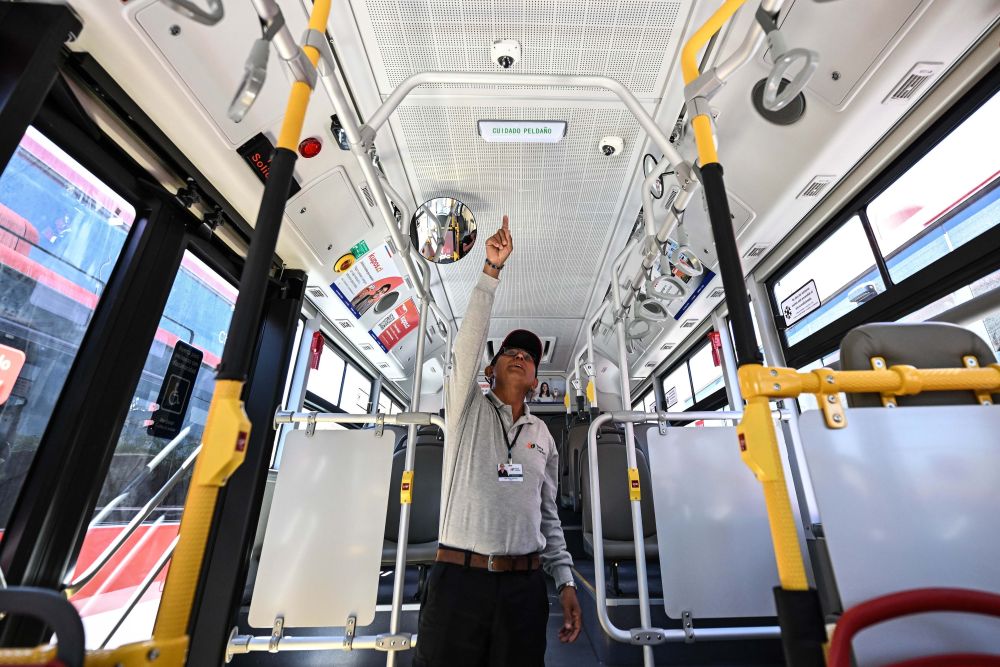 2025年10月16日,在智利科皮亚波,一名司机介绍新启用的中国产新能源公交车。当日,智利北部阿塔卡马大区首府科皮亚波启用121辆中国生产的新能源公交车,成为南美洲首个公交系统全面电动化的城市。