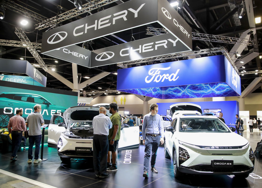 2024年11月8日,在澳大利亚悉尼国际会议中心举行的2024年悉尼国际电动汽车展上,观众参观奇瑞汽车展台。此次车展上,一批中国新能源汽车品牌集中亮相,吸引众多观众咨询和试驾。