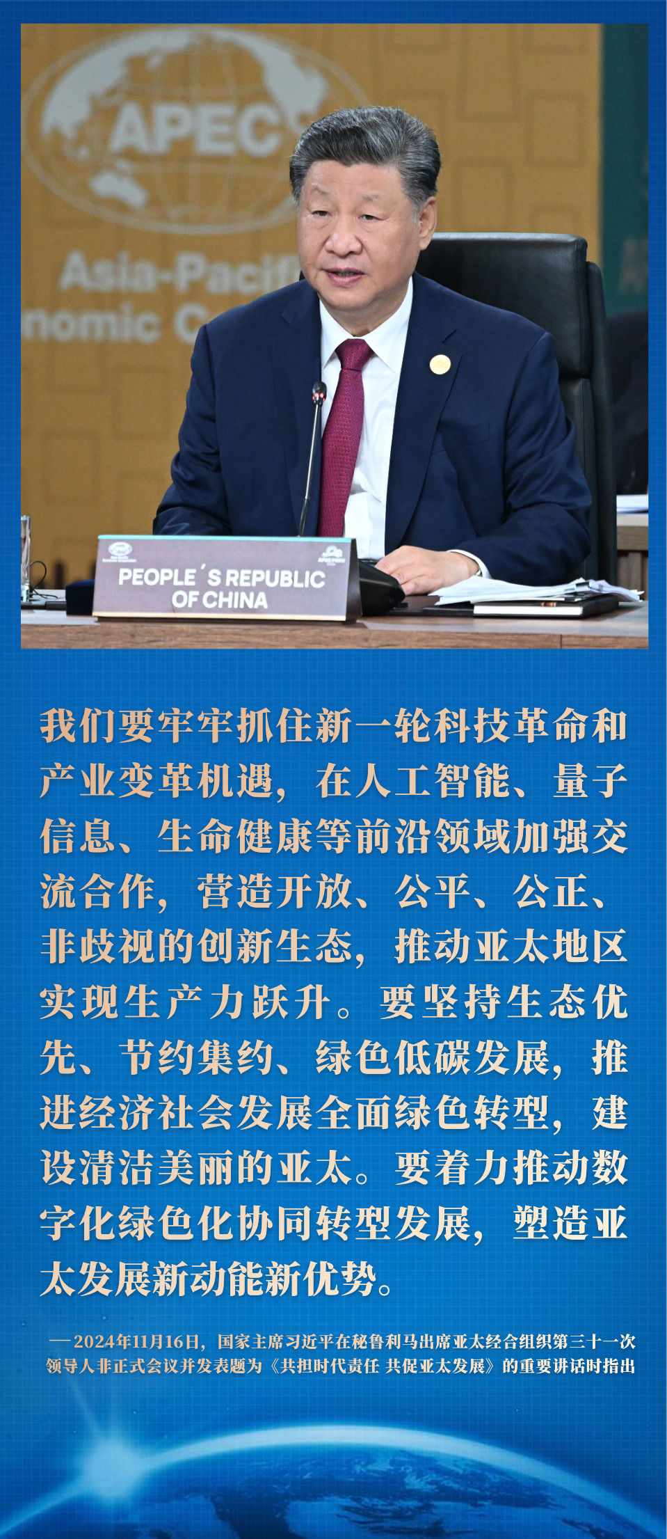 2024年,在亚太经合组织第三十一次领导人非正式会议上,习近平主席提出培育绿色创新的亚太增长动能: