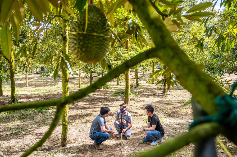 2021年11月21日,在马来西亚“猫山王”榴莲产地彭亨州劳勿,榴莲种植园经营者与“榴莲云平台”工作人员在榴莲土壤传感器旁交谈。由阿里云和马来西亚历佳德有限公司联合打造的“榴莲云平台”,通过智能传感器收集农作物信息,并对土壤、肥料、天气、作物生长周期等进行分析,为榴莲种植提供专业指导方案。