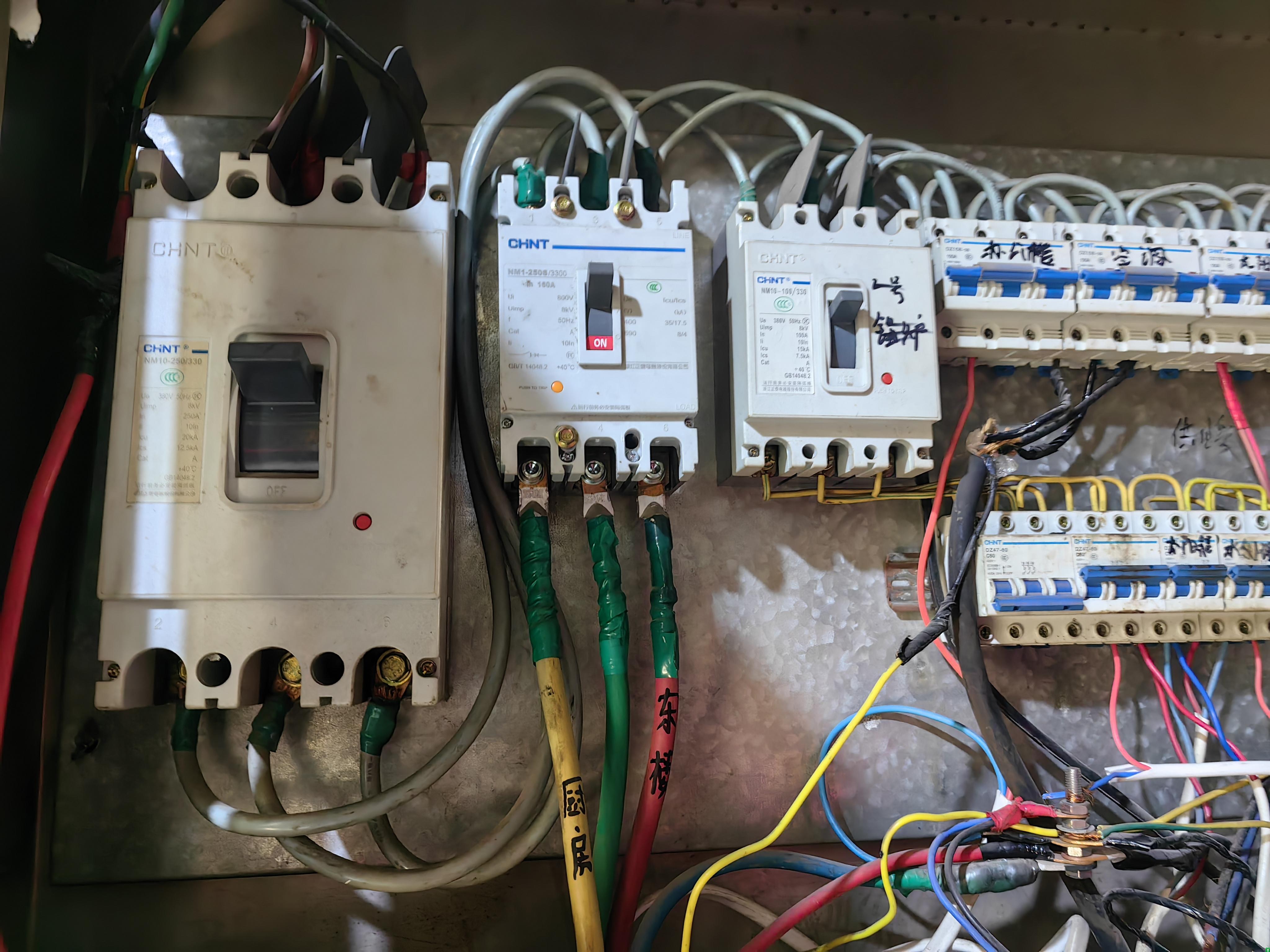 9.氟利昂机房配电箱内断路器相间隔弧板缺失,维修车间空气开关裸露,未设开关盒进行防护