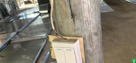 1.车间门口立柱上照明灯开关固定在木板上,且穿管防护不全