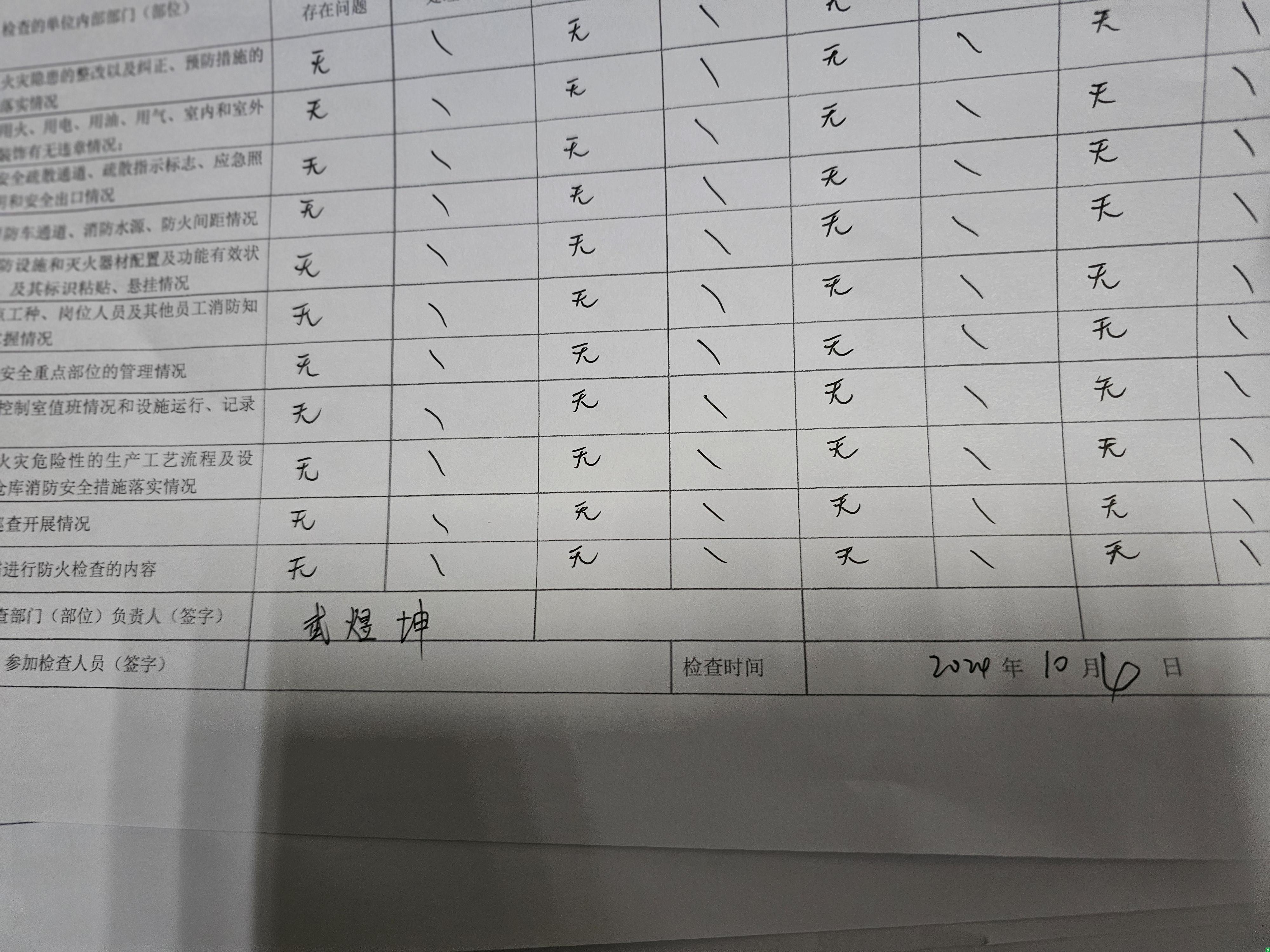2.未按要求进行防火检查,其提供的《防火检查记录》中只有被检查部门负责人签字情况,无参与防火检查的检查人员签字情况