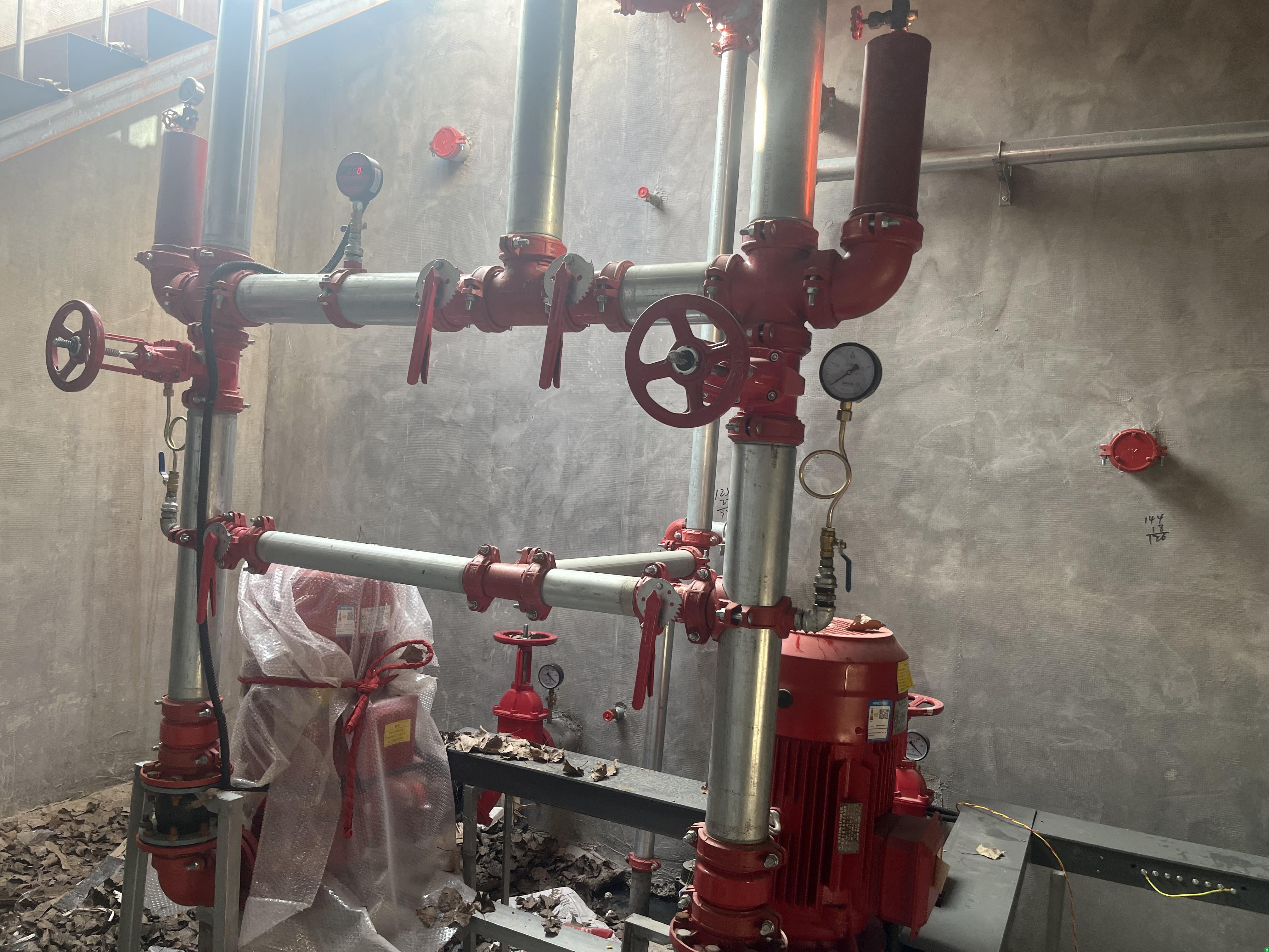 1、消防泵房消防泵未做接地防护,管道无介质流向标识;