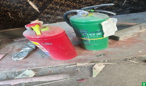 1、北侧铺板车间灭火器未定期检查;