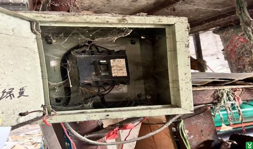 3、铺板车间东侧涂胶机旁电盘箱内杂物较多,电源开关未加隔弧板;
