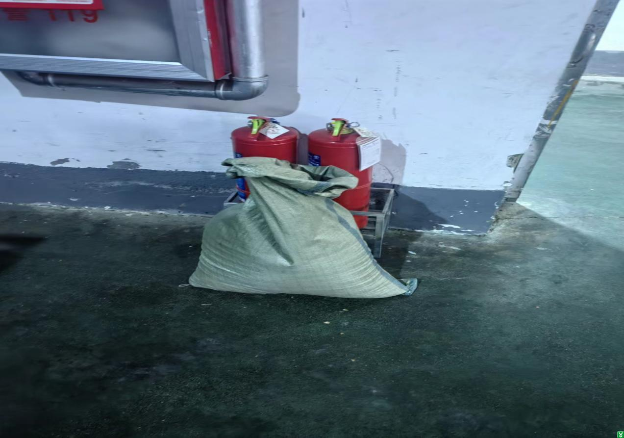 1、脱皮车间灭火器前有杂物;