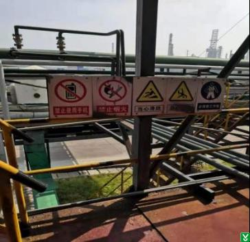4.隐患:乙醇精馏塔二楼警示标志张贴顺序错误
