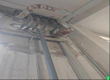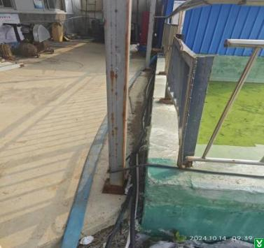 1.隐患:包装车间北门上方电缆桥架锈蚀、破损