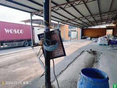 4.隐患:2#生产车间门前原料罐,设置的警示标识不符合规范,且被管路遮挡,无法看到全部。
