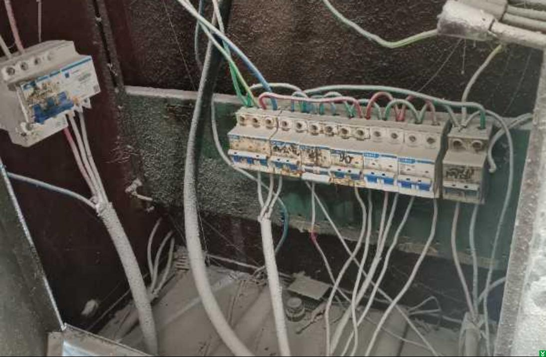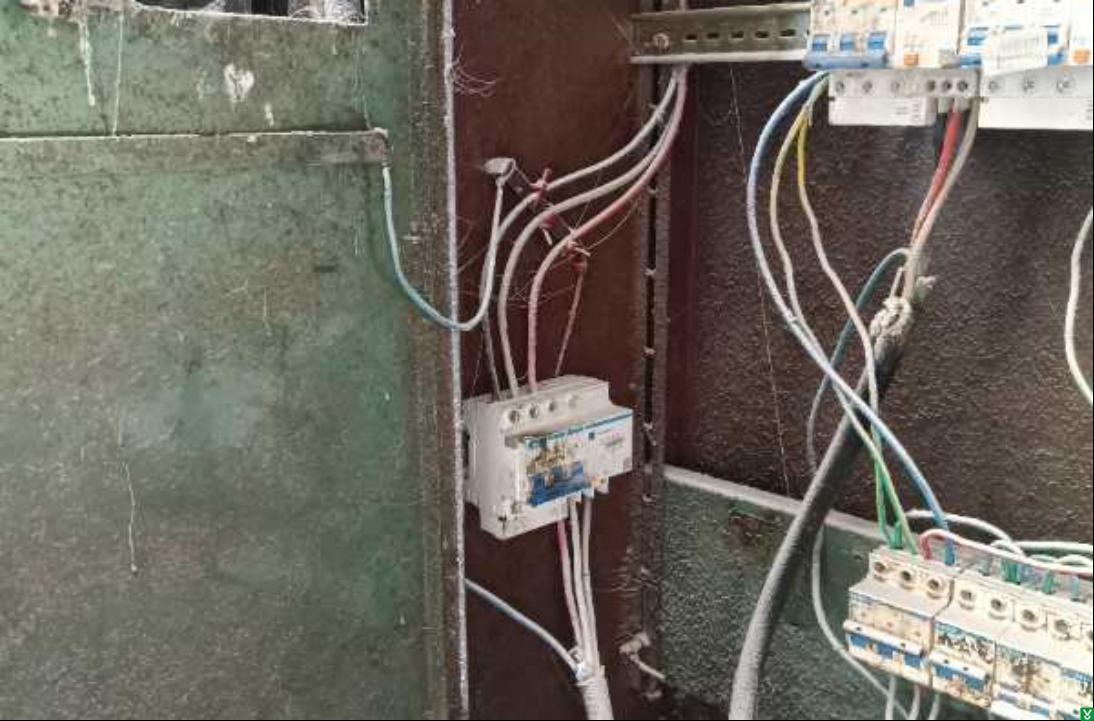 5、车间粉碎机西侧配电箱跨接线不符合标准要求,缠绕连接。