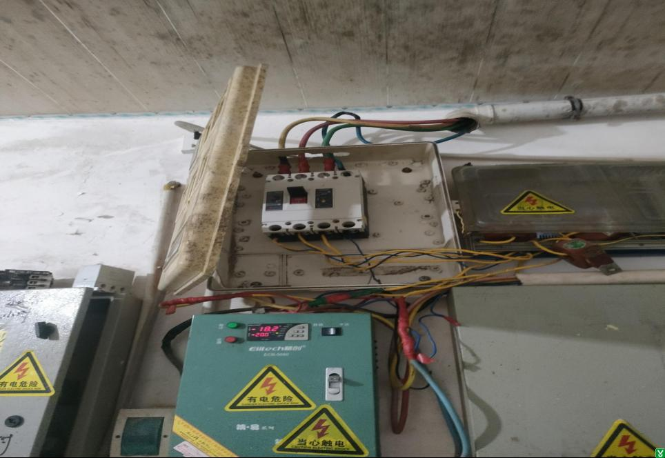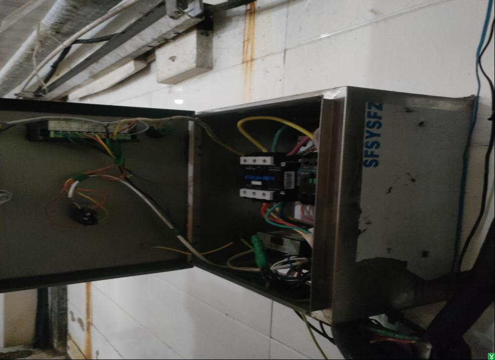 4.生产车间冷冻库北门配电箱箱门跨接线断裂。