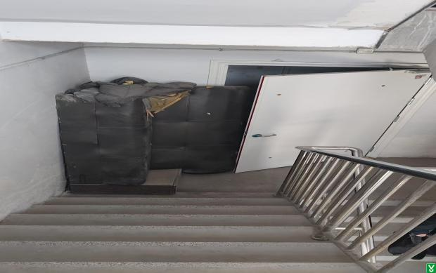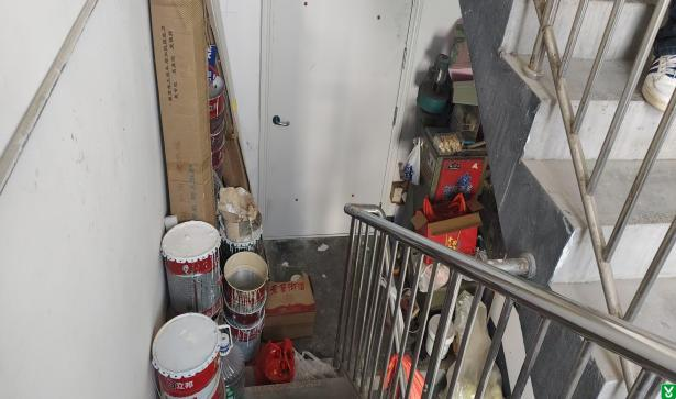 楼宇多处疏散楼梯通道堆积杂物,严重阻塞消防疏散通道。