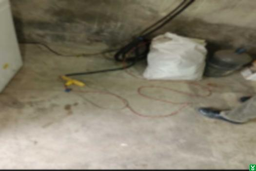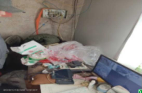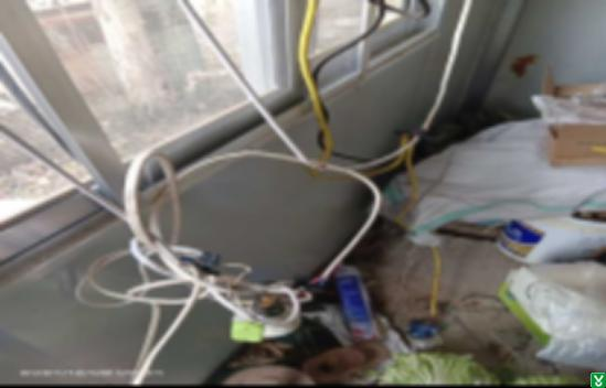 6、南第一间板房内配电盒盒盖缺失,配电盒下部放置衣物,桌上插排有烧焦现象。