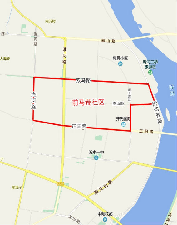 前马荒小区、前马荒安置区、沂河绿洲小区、学府名轩小区、开先国际小区、开先蓝庭小区、城投华府小区、沂水制胶厂家属院、沂水县第四实验中学、沂水恒源胶业有限公司、沂水城市建设投资集团有限公司等 |