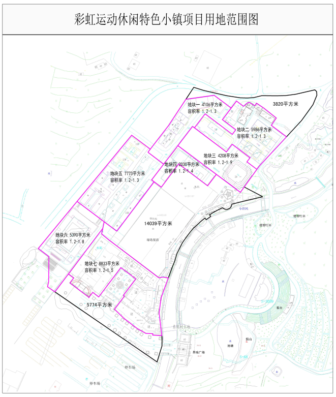 (二)彩虹运动休闲特色小镇项目。该项目由山东亲情沂蒙旅游有限公司开发建设,位于沂城街道东院村以东。为解决部分建筑跨宗地建设、后期确权等问题,将原有4宗地块(共61959平方米)整合后调整为10宗地块,总用地面积不变,其中7宗地块(共38326平方米),用地性质由H9/其他建设用地(风景名胜区设施用地)调整为0904/其他商业服务业用地,地块一、地块二、地块五容积率调整为1.2—1.3,地块三容积率调整为1.2—1.9,地块四容积率调整为1.2—1.4,地块六容积率调整为1.2—1.8,地块七容积率调整为1.2—1.5;其余3地块共23633平方米,维持原用地性质、容积率不变。