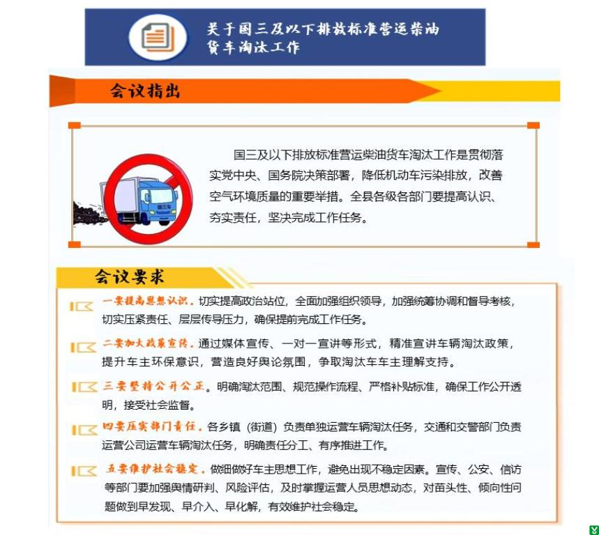 会议强调,要高度重视国三及以下排放标准营运柴油货车淘汰工作,领导小组成员单位要充分发挥统筹协调和督导作用,切实压紧责任,层层传导压力。要加大宣传力度,通过媒体宣传和发放明白纸等形式,广泛宣传淘汰政策要求,精准宣讲到户,取得群众理解和认可。要坚持公开公正原则,“一把尺子量到底” ,规范操作流程,严格补贴标准,广泛接受社会监督。要进一步压实责任,建立日调度通报制度,抓好风险评估,确保工作如期完成。