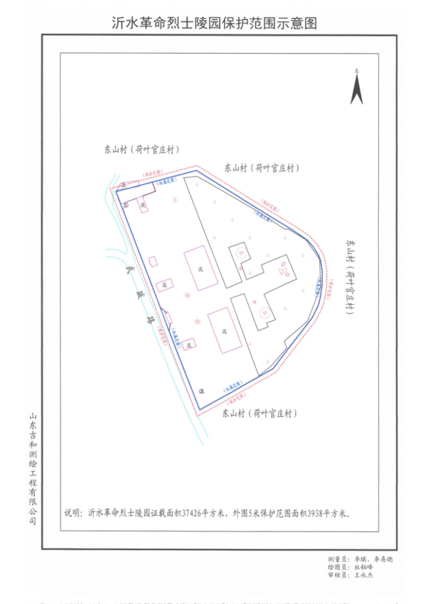 沂水革命烈士陵园、王庄烈士陵园、埠前庄烈士陵园、对崮山革命烈士公墓等4处烈士纪念设施保护范围:沂水革命烈士陵园占地面积37426㎡,划定外围5米保护范围面积3938㎡,合计保护范围面积41364㎡;王庄烈士陵园证载面积11277㎡,划定外围5米保护范围面积2354㎡,合计保护范围面积13631㎡;埠前庄烈士陵园占地面积4574㎡,划定外围5米保护范围面积1639㎡,保护范围面积6213㎡;对崮山革命烈士公墓证载面积617㎡,划定外围5米保护范围面积604㎡,保护范围面积1221㎡。