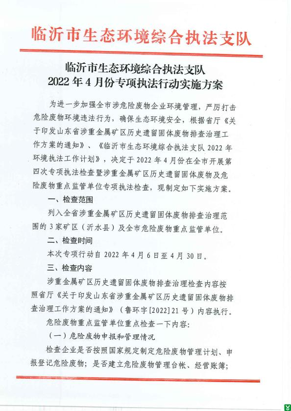 | 标 题: | 临沂市生态环境综合执法支队2022年4月专项执法行动工作方案 | ||