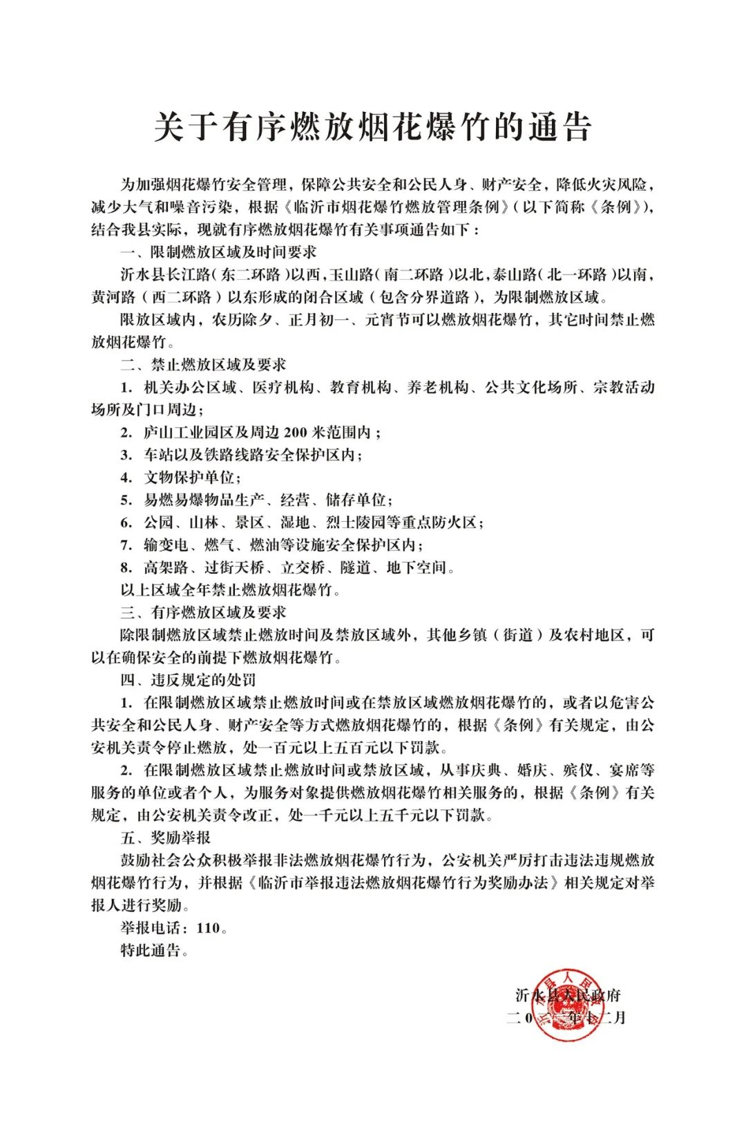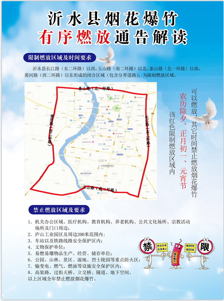 沂水县长江路(东二环路)以西,玉山路(南二环路)以北,泰山路(北一环路)以南,黄河路(西二环路)以东形成的闭合区域(包含分界道路),为限制燃放区域。