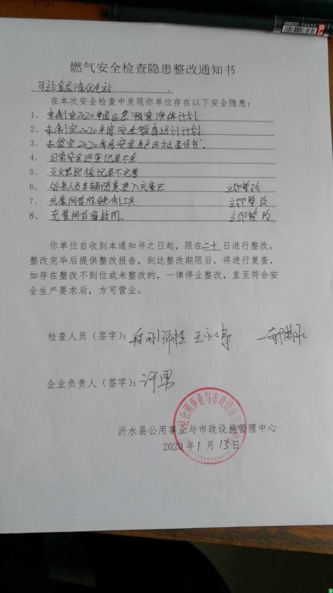 | 标 题: | 2020年1月份燃气安全检查隐患整改通知书(马站金龙液化气站) | ||