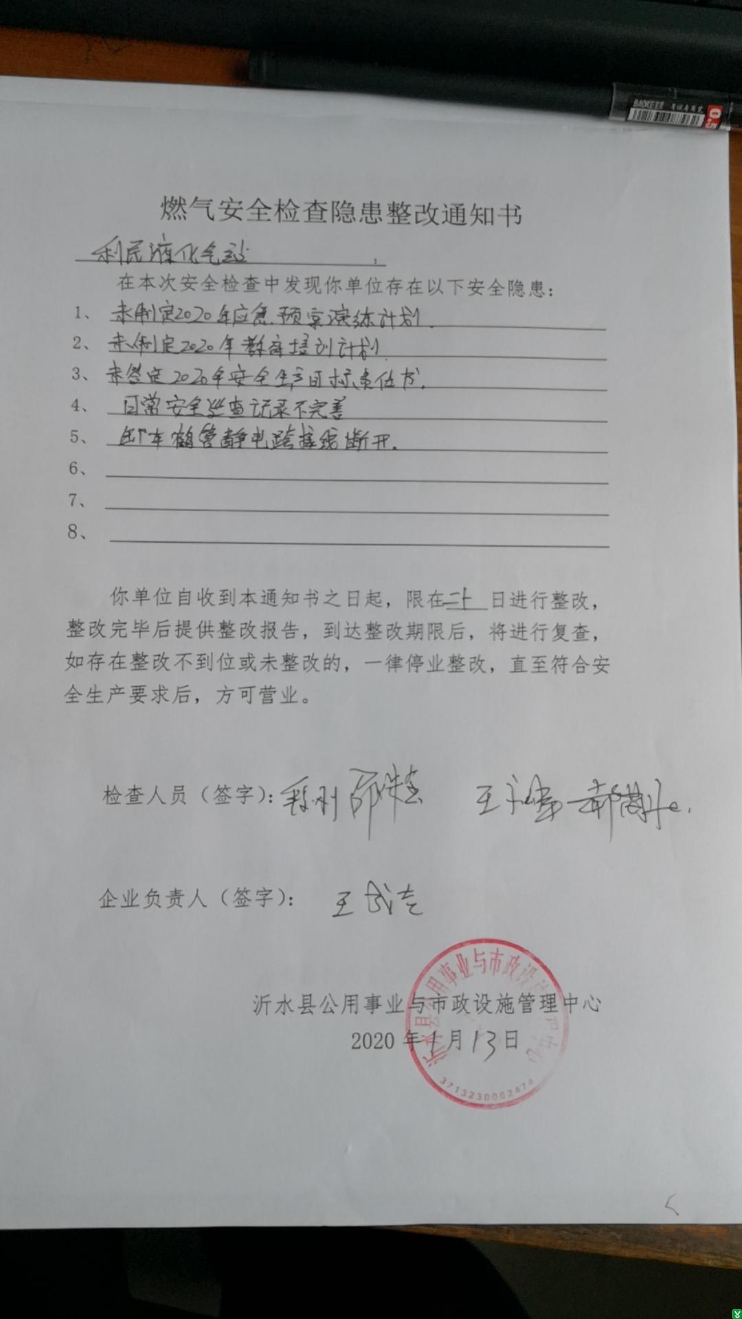 | 标 题: | 2020年1月份燃气安全检查隐患整改通知书(利民液化气站) | ||