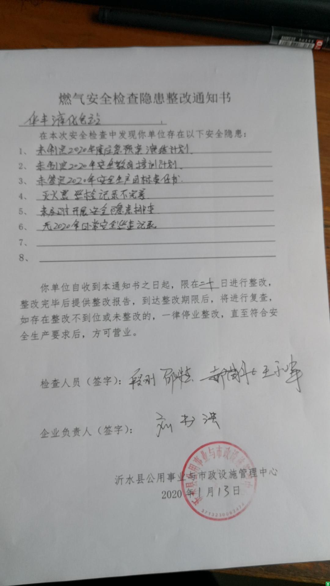 | 标 题: | 2020年1月份燃气安全检查隐患整改通知书(华丰液化气站) | ||
