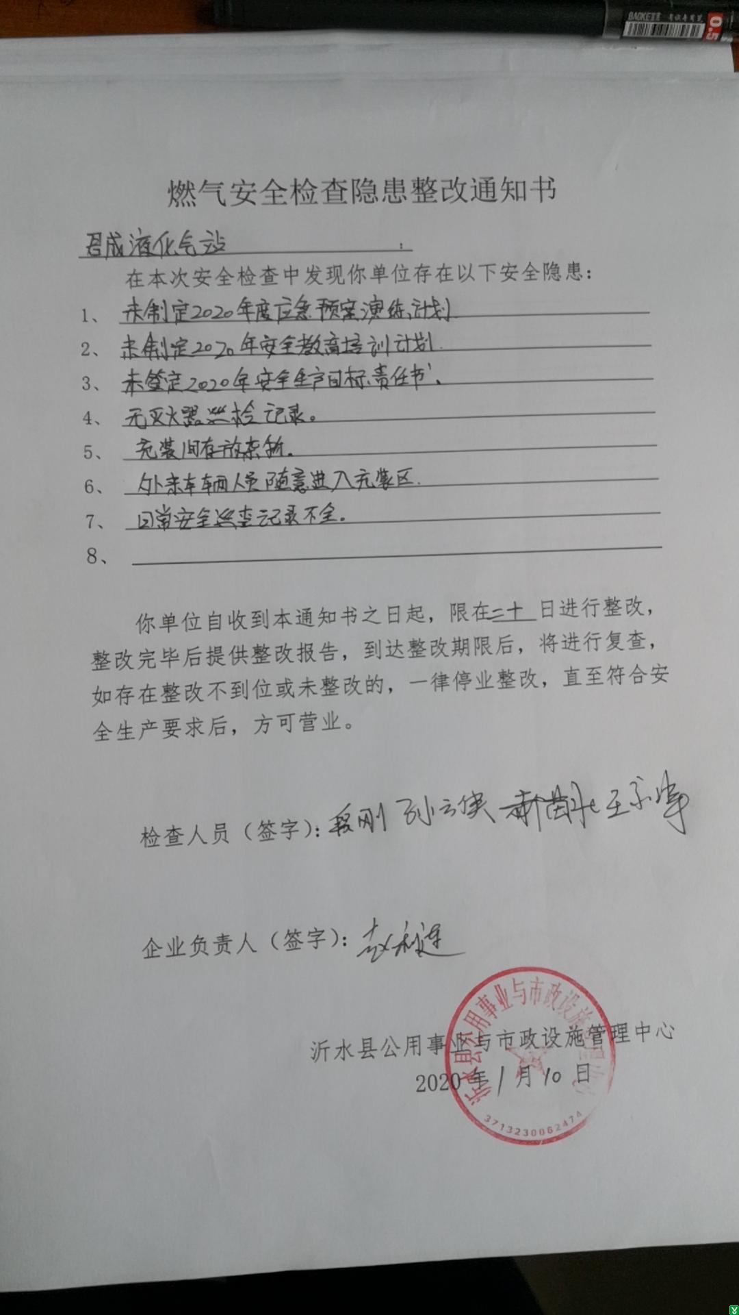 | 标 题: | 2020年1月份燃气安全检查隐患整改通知书(君成液化气站) | ||