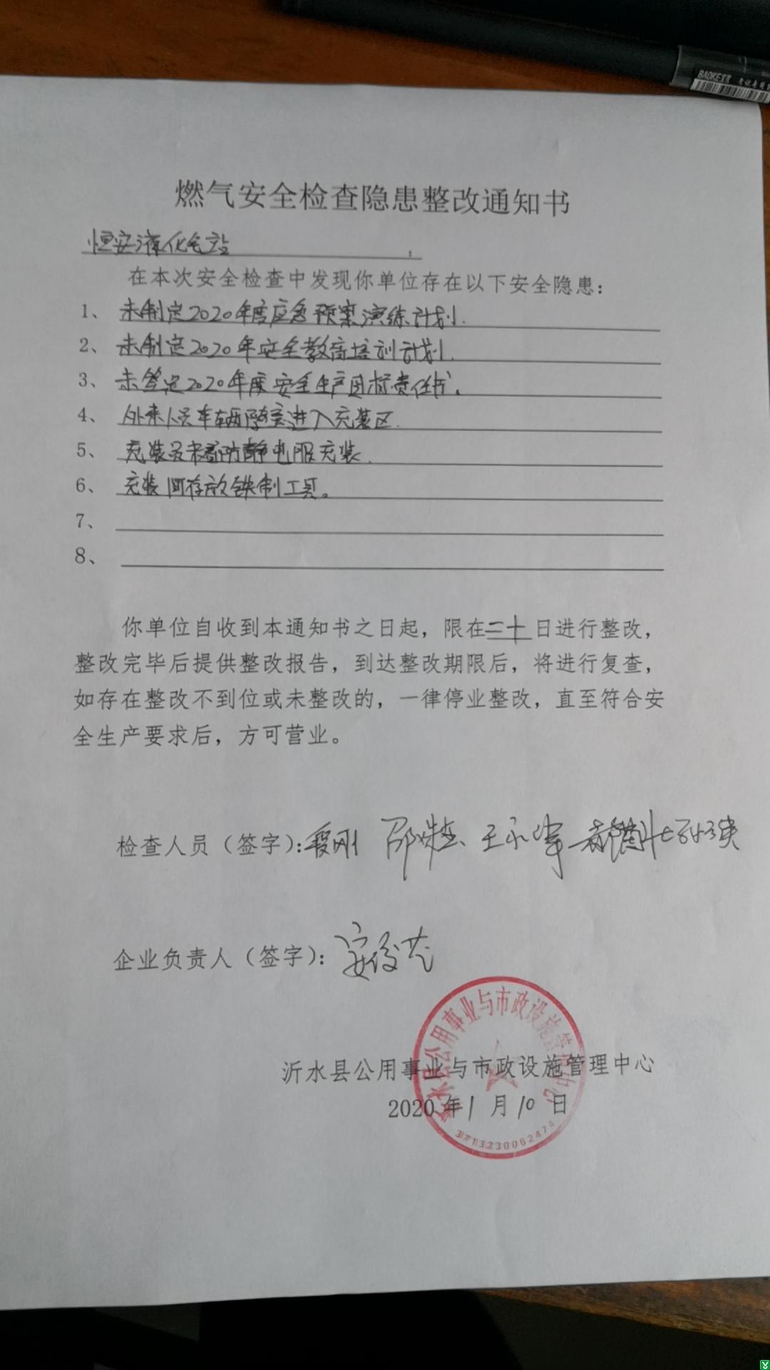 | 标 题: | 2020年1月份燃气安全检查隐患整改通知书(恒安液化气站) | ||