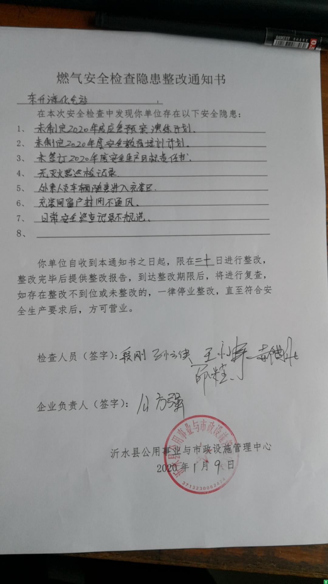 | 标 题: | 2020年1月份燃气安全检查隐患整改通知书(东升液化气站) | ||