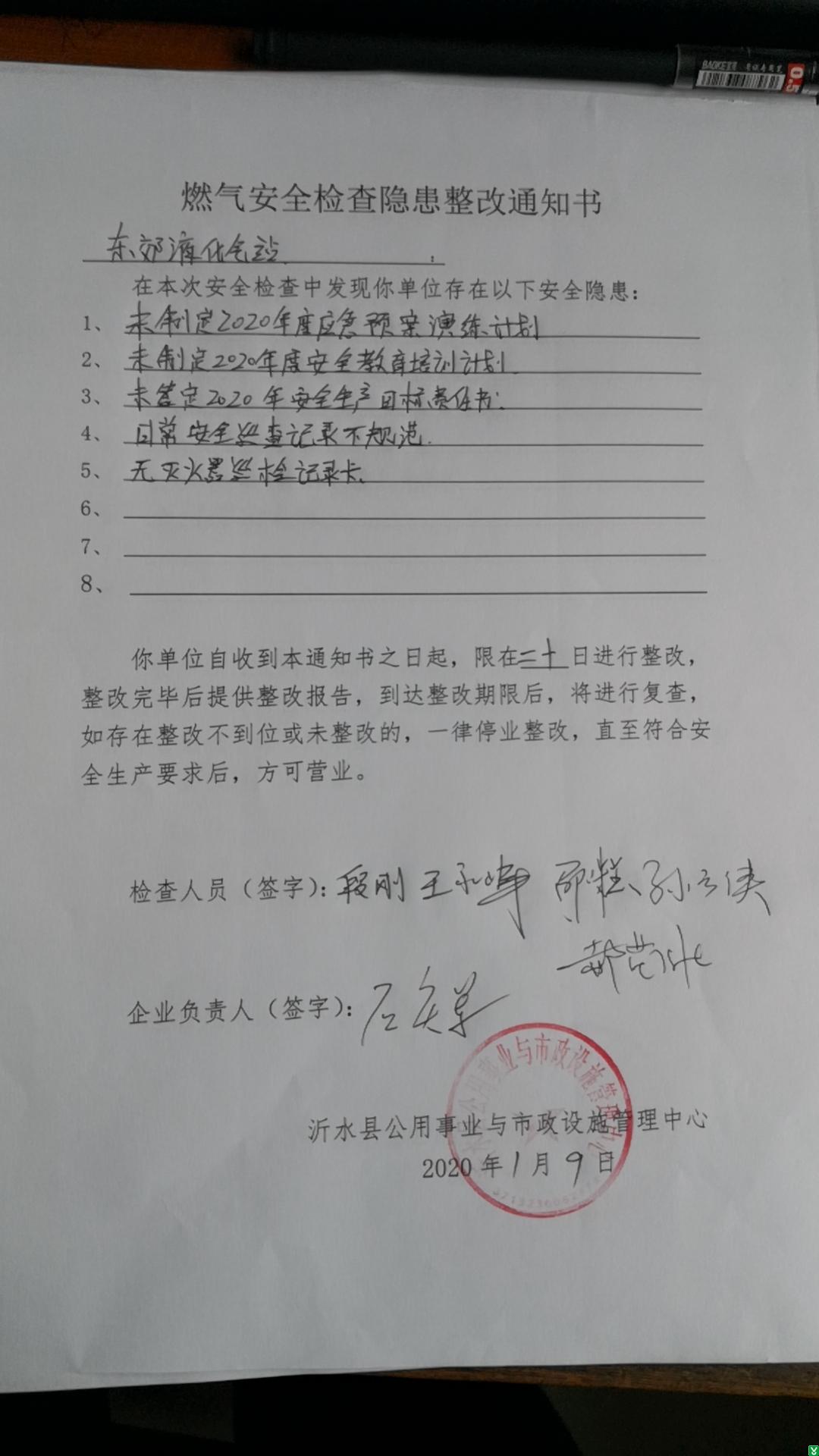 | 标 题: | 2020年1月份燃气安全检查隐患整改通知书(东郊液化气站) | ||