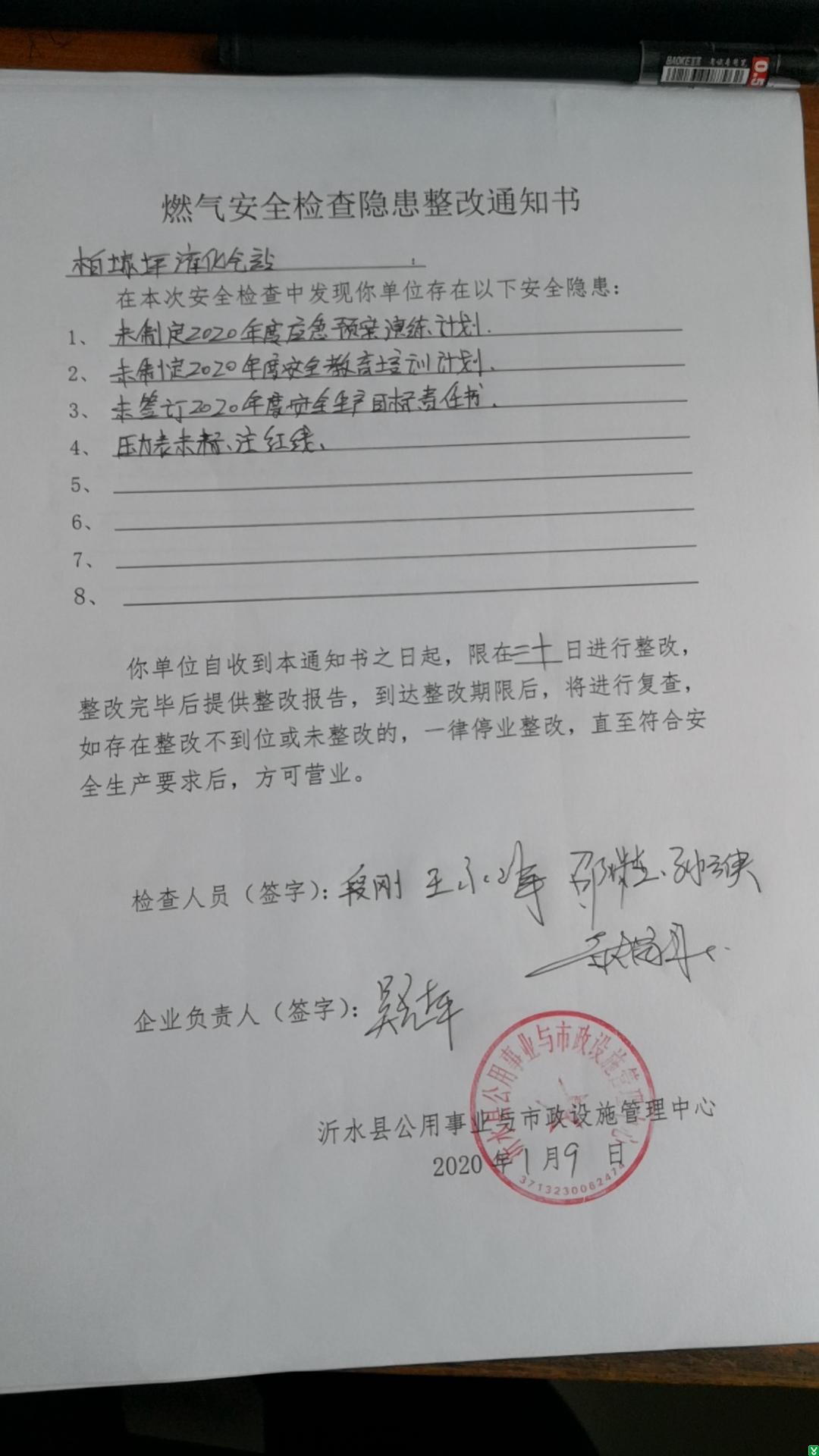 | 标 题: | 2020年1月份燃气安全检查隐患整改通知书(柏家坪液化气站) | ||