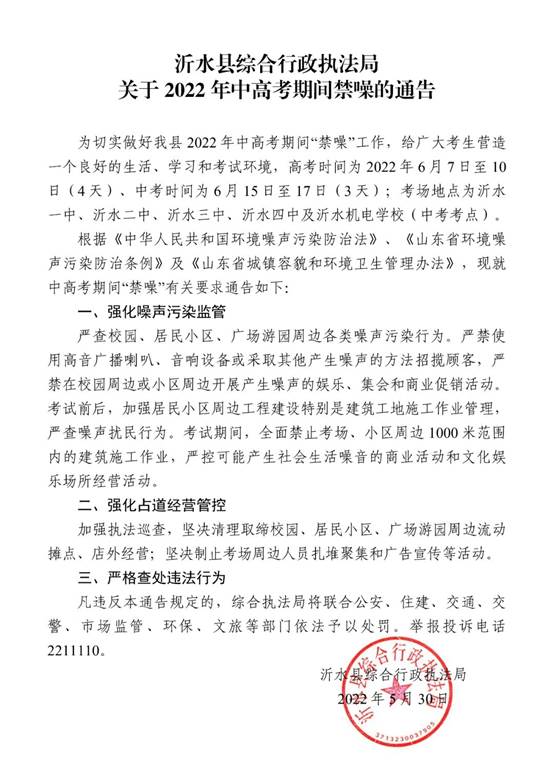 标       题: 沂水县综合行政执法局关于2022年中高考期间禁噪的通告