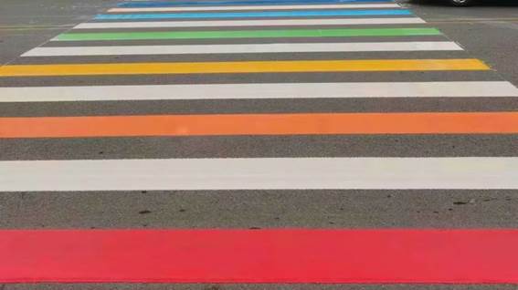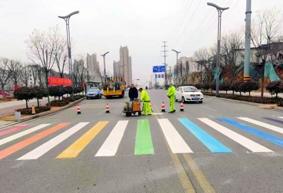 相较于普通的白色斑马线,正在施划的彩色斑马线,颜色醒目、美观大方,能有效提醒司机在经过学校路口斑马线时主动减慢车速,礼让行人,增强市民“车让人,人文明”的交通安全意识,为学生、老师上下学提供了更多安全保障。