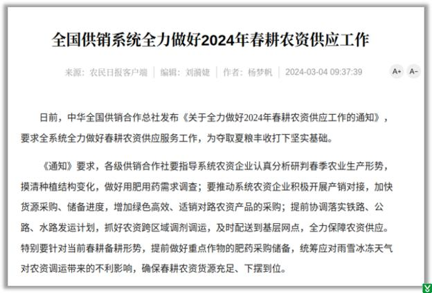 日前,中华全国供销合作总社发布《关于全力做好2024年春耕农资供应工作的通知》,要求全系统全力做好春耕农资供应服务工作,为夺取夏粮丰收打下坚实基础。