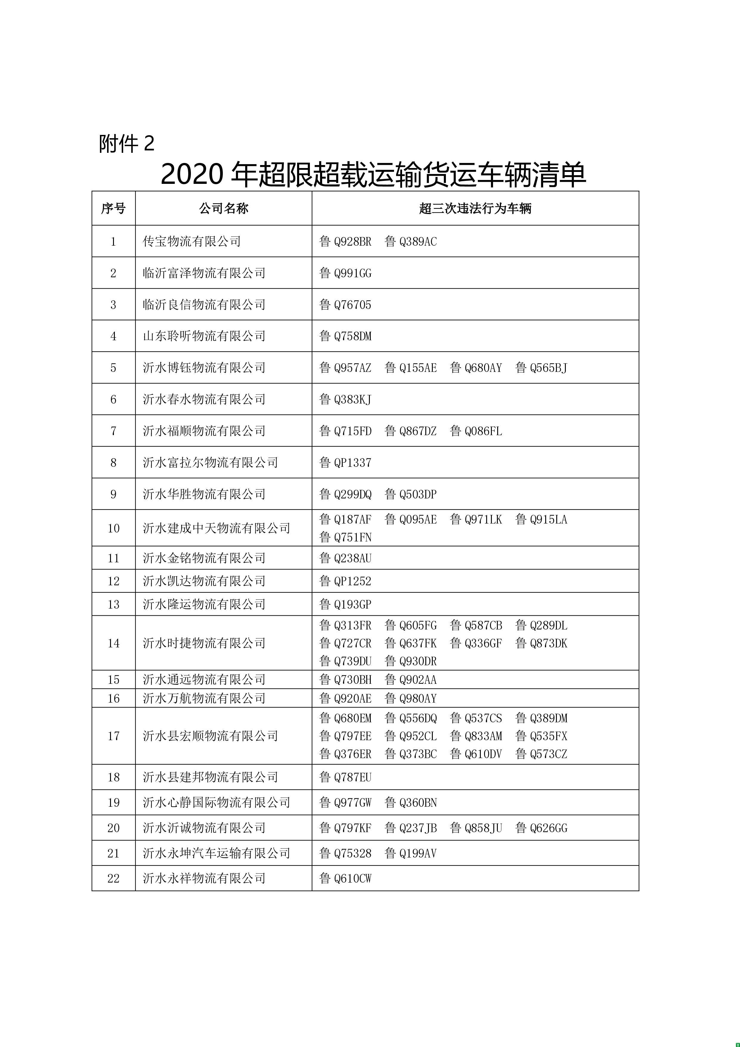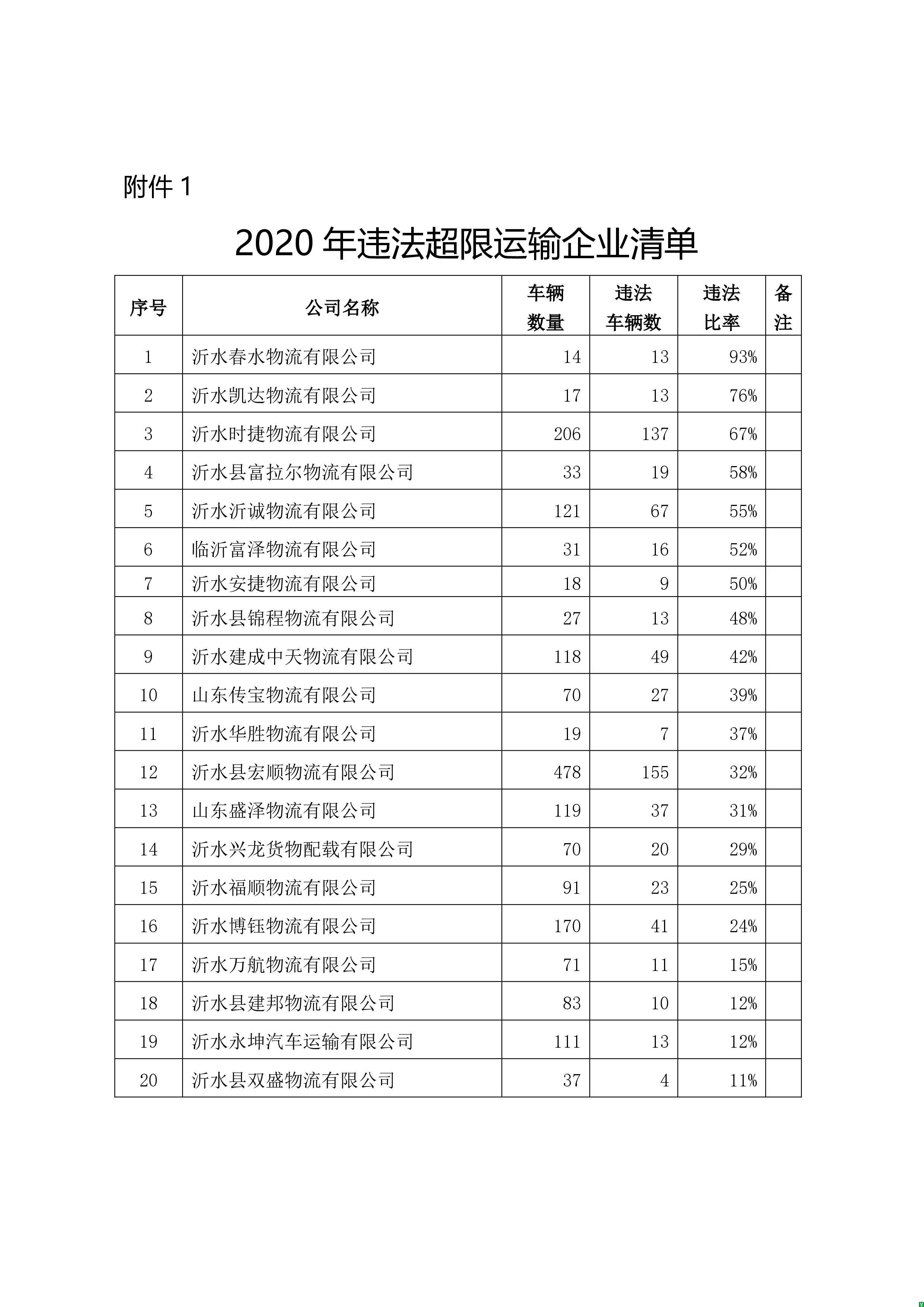 为进一步强化货运站场切实履行货运源头治超主体责任,严格落实“一超四罚”,依法对超限超载运输货运车辆、驾驶人、货运源头单位、道路运输企业实施追踪查处,依据《公路安全保护条例》规定,根据交通运输、交警部门治超查超记录,现将2020年违法超限运输情节严重企业及相关车辆清单予以公示,公示期为7天。