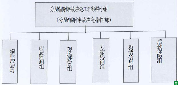 县分局辐射事故应急领导小组下设辐射事故应急办公室(简称辐射应急办)、应急监测组、现场处置组、专家咨询组、舆情信息组以及后勤保障组。