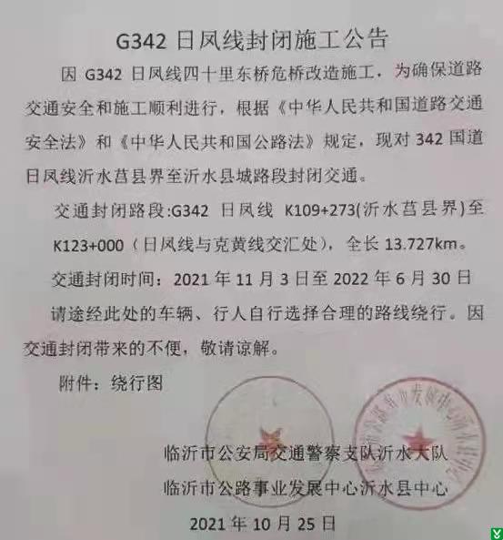 封闭路段:G342日凤线K109+273(沂水莒县界)至K123+000(日凤线与克黄线交汇处),全长13.727km