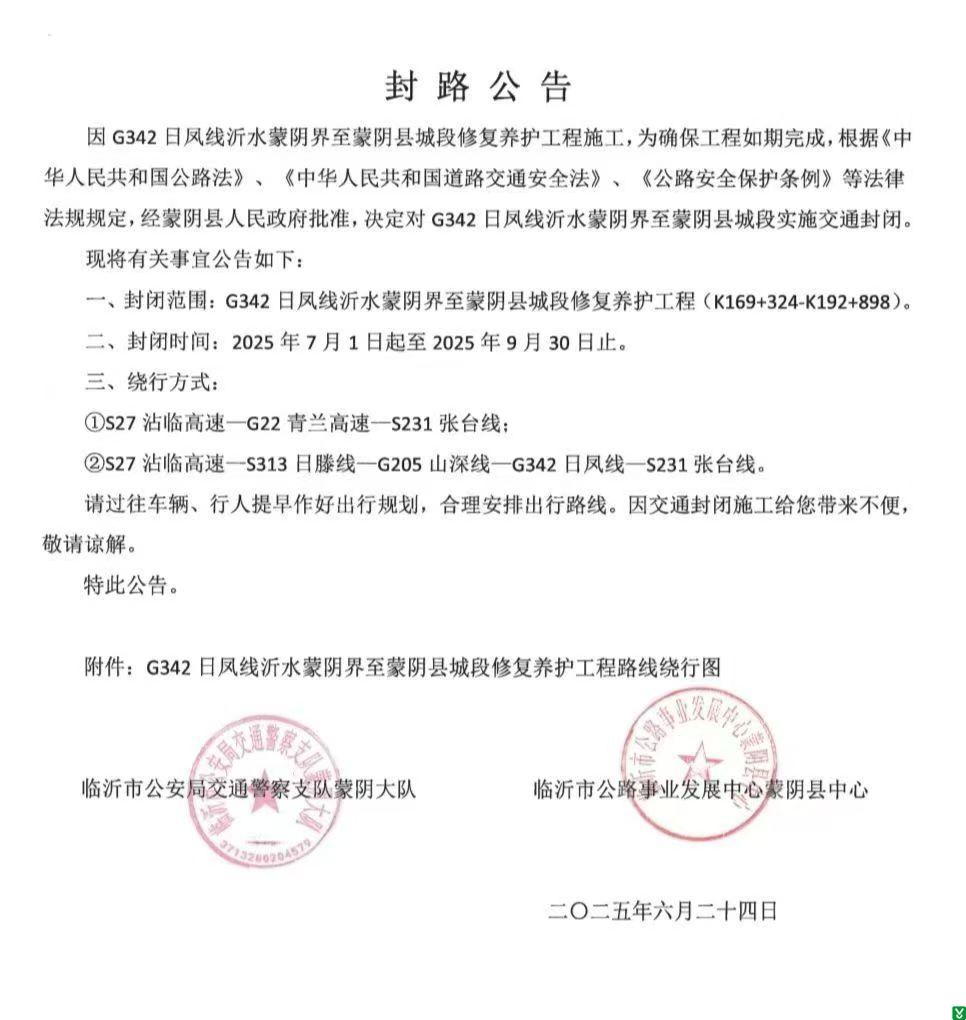 | 标 题: | G342日凤线沂水蒙阴界至蒙阴县城段修复养护工程施工封路公告 | ||