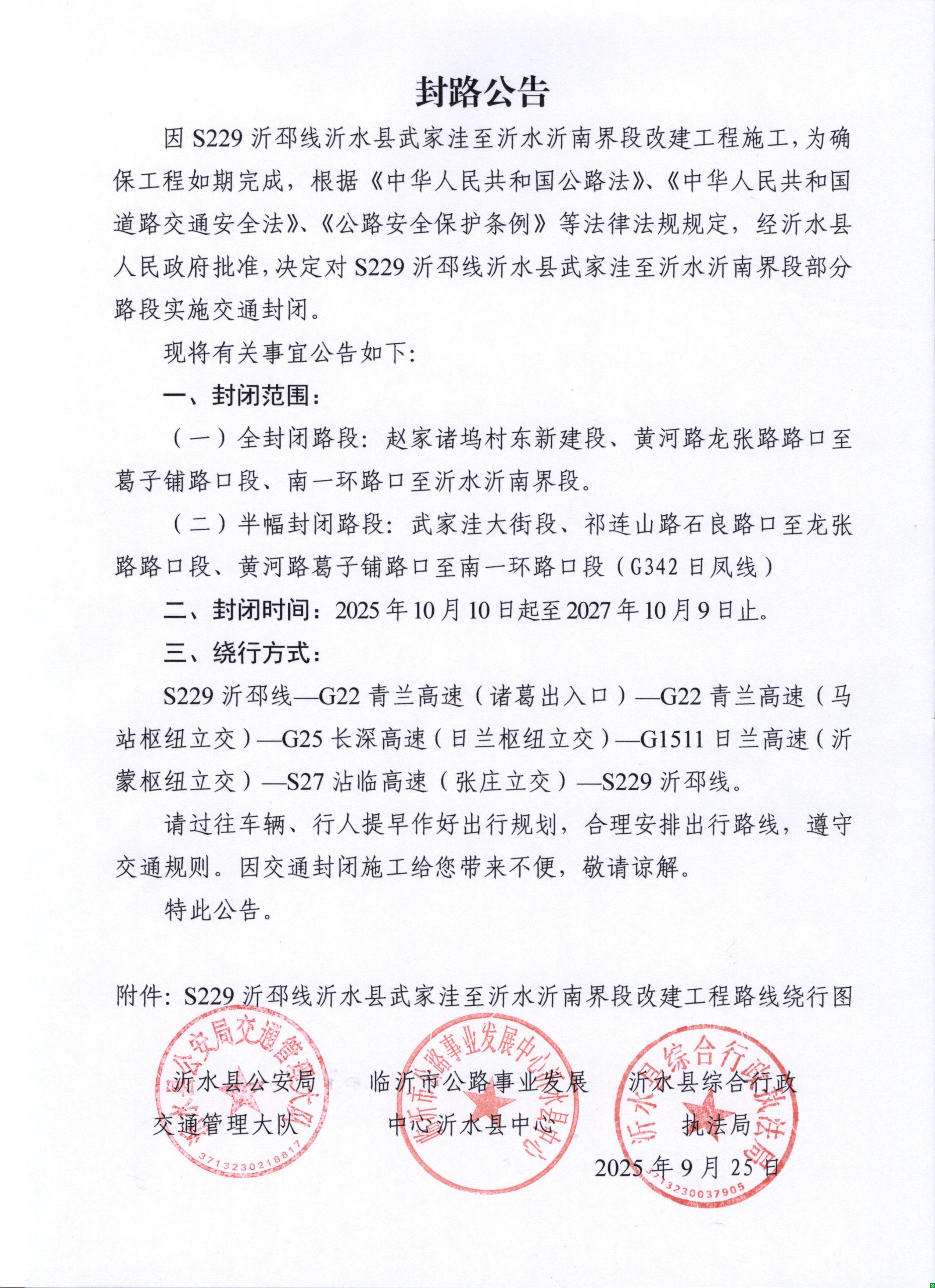 因S229沂邳线沂水县武家洼至沂水沂南界段改建工程施工,为确保工程如期完成,根据《中华人民共和国公路法》、《中华人民共和国道路交通安全法》、《公路安全保护条例》等法律法规规定,经沂水县人民政府批准,决定对S229沂邳线沂水县武家洼至沂水沂南界段部分路段实施交通封闭。
