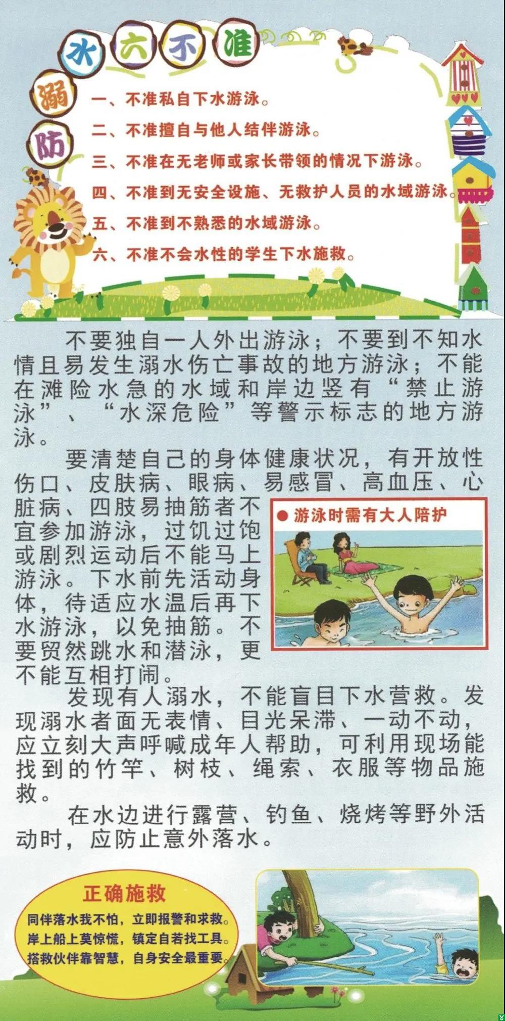 溺水是造成中小学生意外死亡的第一杀手。春季以后,天气逐渐变热,溺水又将进入高发季,希望广大家长务必增强安全意识和监护意识,切实承担起监护责任,加强对孩子的教育和管理。特别是加强放学后、周末、节假日期间和孩子结伴外出游玩时的管理,经常进行预防溺水等安全教育,给孩子传授相关知识和技能。不断加强孩子安全意识和自我保护意识,提高孩子们的避险防灾和自救能力,严防意外事故的发生。要重点教育孩子做到“六不”:不私自下水游泳;不擅自与他人结伴游泳;不在无家长或教师带领的情况下游泳;不到无安全设施、无救援人员的水域游泳;不到不熟悉的水域游泳; 不熟悉水性的学生不擅自下水施救。尤其要教育孩子遇到同伴溺水时避免手拉手盲目施救,要智慧救援,立即寻求成人帮助。学生安全工作需要各方面尽心尽责,密切配合、齐抓共管。让我们携起手来,共同为保障广大中小学生平安健康成长而努力。祝您的孩子平安、健康、快乐!