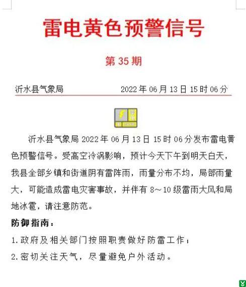沂水县气象局2022年06月13日15时06分发布雷电黄色预警信号。受高空冷涡影响,预计今天下午到明天白天,我县全部乡镇和街道阴有雷阵雨,雨量分布不均,局部雨量大,可能造成雷电灾害事故,并伴有8~10级雷雨大风和局地冰雹,请注意防范。今天夜间到明天白天,阴有雷雨或阵雨,东南风3~4级阵风5~6级,雷雨地区雷雨时阵风8~10级,气温17~26℃;14日夜间到15日白天,多云间阴,局部有雷雨或阵雨,东南风3~4级,气温16~29℃;15日夜间到16日白天,多云间阴,局部有雷雨或阵雨,偏南风3~4级阵风5~6级,气温19~32℃。