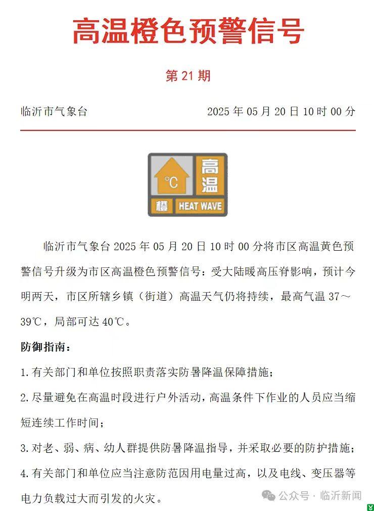 2025年5月20日10时00分临沂市气象台将高温黄色预警升级为高温橙色预警:受大陆暖高压脊影响预计今明两天我市高温天气仍将持续最高气温37~39℃局部可达40℃临沂市气象台将市区高温黄色预警信号升级为市区高温橙色预警信号:受大陆暖高压脊影响预计今明两天市区所辖乡镇(街道)高温天气仍将持续最高气温37~39℃局部可达40℃。