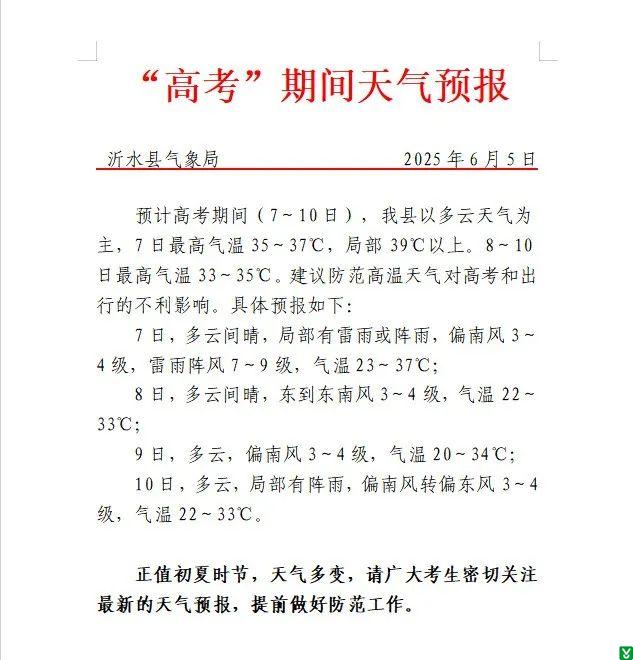 | 标 题: | 有雨!高温!刚刚,沂水高考天气出炉! | ||