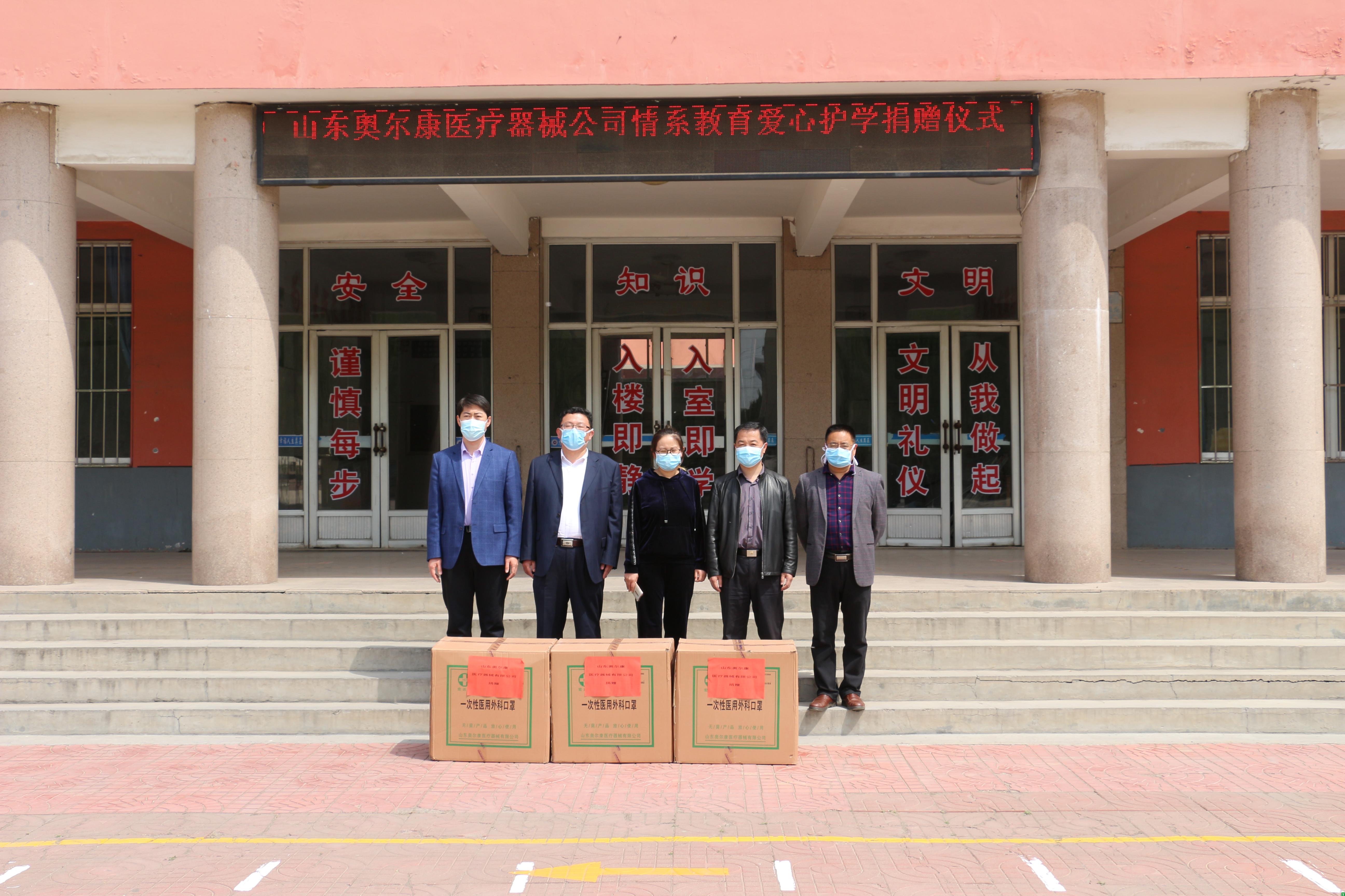 4月26日,一场简单而特殊的捐赠仪式在沂水县高桥镇中心初中举行,为帮助学校复学做好防疫物资储备工作,助力学校复学复课,爱心企业山东奥尔康医疗器械有限公司经理秦晓娣将12000只医用外科口罩捐赠给高桥镇中心校,助力学校开学复课,镇主要领导,校方负责人参加捐赠仪式。