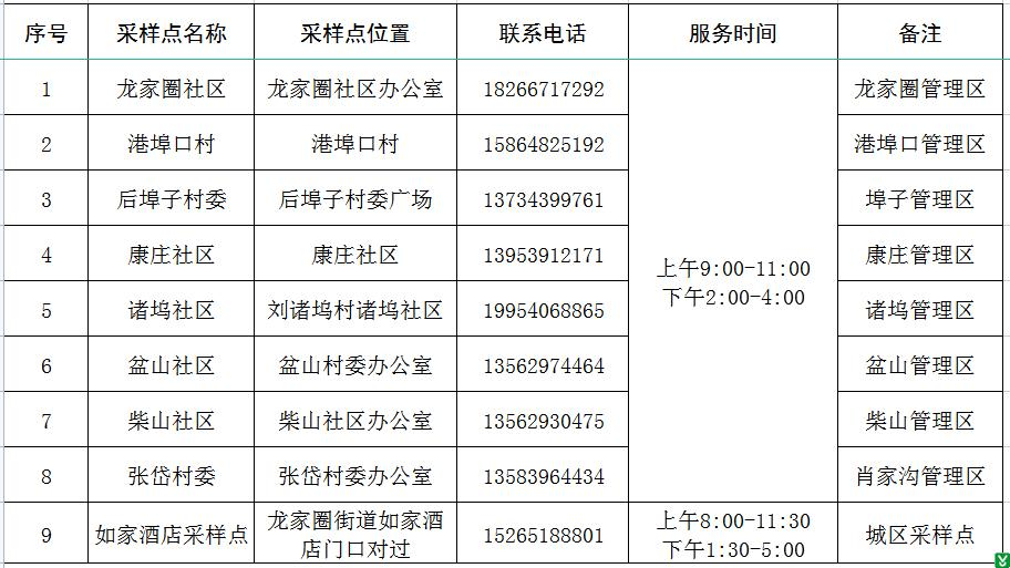 根据上级要求,为广大人民群众核酸采样便利,龙家圈街道辖区内设置9个固定采样点,后期根据疫情形势及上级要求及时动态调整。一、设置地点:
