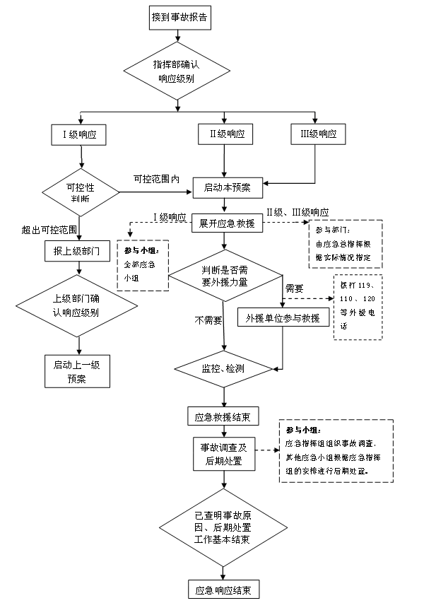 4、应急结束。事故现场得到有效控制、事故险情得到根本消除,经现场指挥部确认后,经批准后,宣布应急结束。