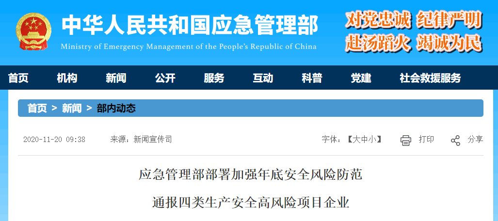 为加强年底安全风险防范,进一步明确安全监管和风险防控重点,根据典型事故特点和事故企业存在的突出共性问题,应急管理部日前通报了四类生产安全高风险项目企业,要求各地应急管理部门在监管检查中要重点关注。
